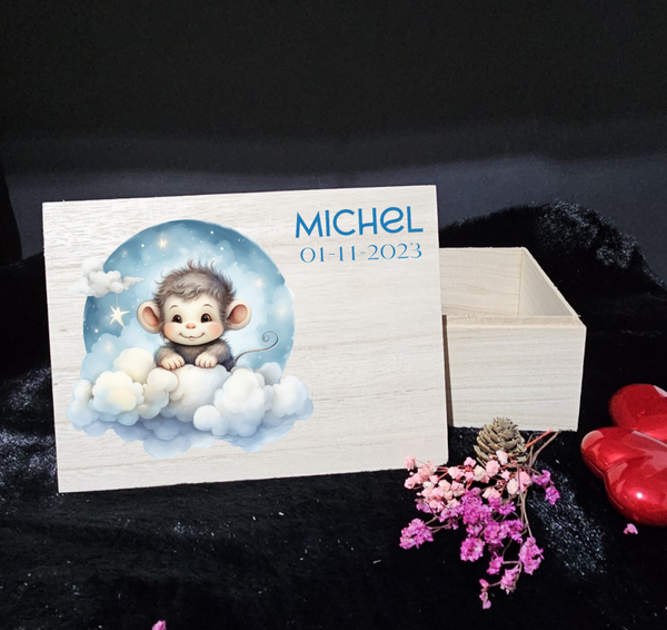 Het kistje kan gepersonaliseerd worden met naam en geboortedatum.