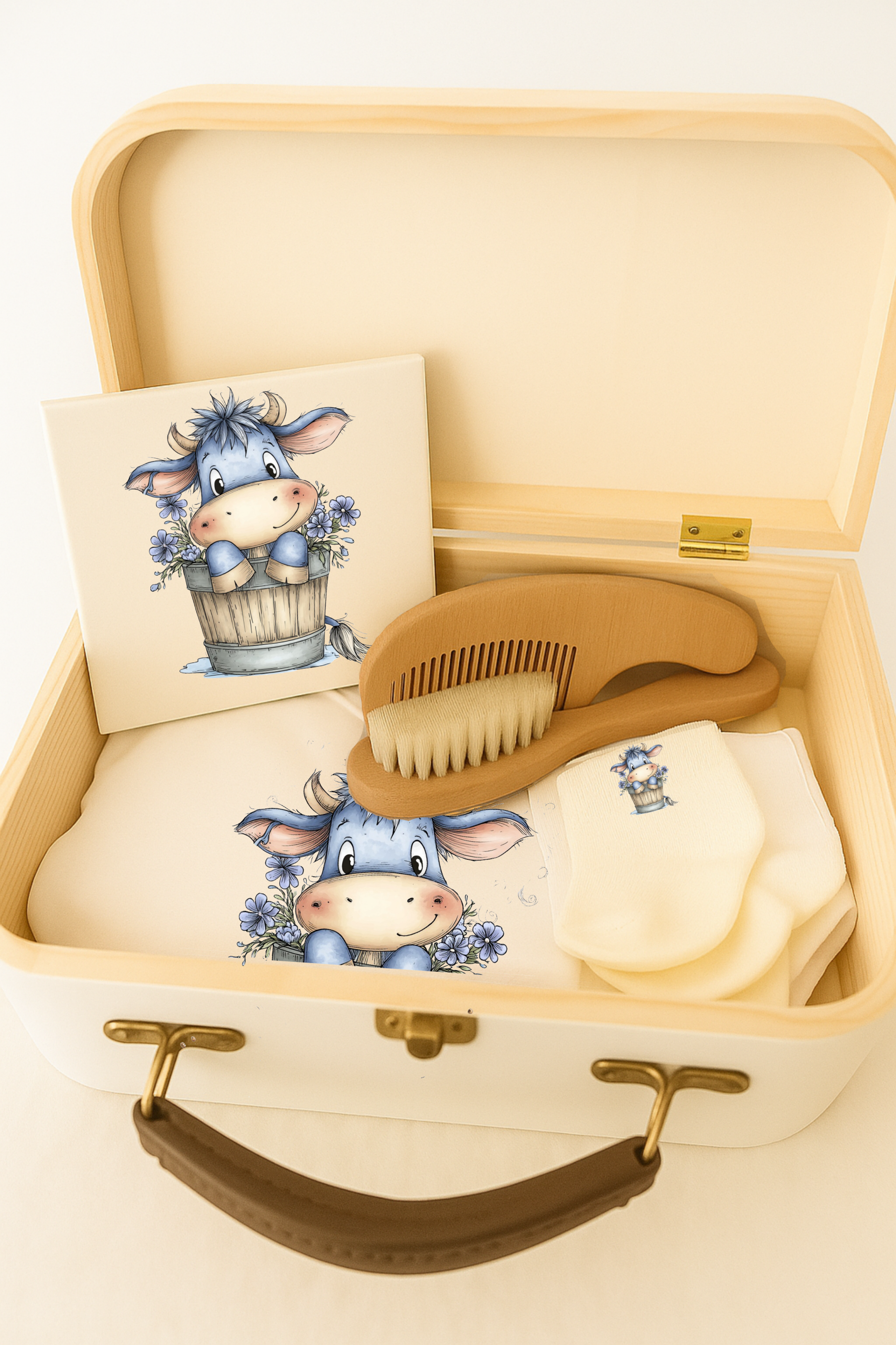 Dit schattige koffertje met de lieve blauwe ezel is een perfect persoonlijk cadeau voor een pasgeboren baby. In het koffertje vind je een zacht rompertje, baby-sokjes, houten borstel- en kamsetje en een keramiek tegeltje – alles in zachte, natuurlijke tinten en met dezelfde vrolijke ezelprint.